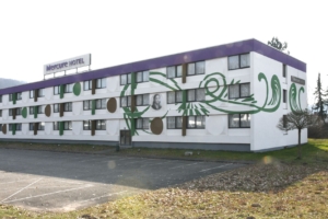 Das Gelände des ehemaligen Frauenlagers. 1975 wurde es mit einem Hotel überbaut. Das Rundbild an der Fassade wurde im Rahmen der Neugestaltung der Gedenkstätte im Jahr 2004 angebracht. Es zeigt die ehemalige Internierte Yvonne Berman.