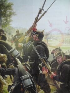 Die Tafel wahrte den französischen Widerstandskämpfern ein Andenken fürwahr, aber der Blick ging über sie hinaus in die Geschichte. Daher war die die Tafel nicht in Richtung „jenseits des Rheins“, also in Richtung Saarbrücken bzw. Preußen gerichtet, sondern in Richtung Frankreich, genauer: den Spicherer Höhen. Dorthin, wo für den Inhaftierten Bernard Cognet seine Heimat lag: „Das Lager Neue Bremm ist nur wenige Kilometer von der französischen Grenze entfernt. Morgens auf dem Appellplatz konnten wir in der Ferne, in Richtung Frankreich ein riesiges Kreuz auf dem Gipfel eines Hügels sehen. Es befindet sich auf der Grenze, hinter der sich unser Vaterland, unser Heim befand.“[18] Der Obelisk und die Tafel lenkten den Blick über das Löschwasserbecken und das umzäunte Lagergelände zu den Spicherer Höhen. Die Anlage war auf den Rothen Berg ausgerichtet. Dort fand am 6. August 1870 die erste Schlacht des Krieges von 1870/71 statt. Das gleichnamige Großgemälde von Anton von Werner stellt dieses Ereignis nach. Am rechten Bildrand taucht das Gasthaus Neue Bremm und die Straße auf, auf der fast 50 Jahre später der Obelisk als Teil der Gedenkstätte stehen sollte.