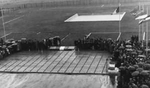 Sicht über das Löschwasserbecken auf dei Spicherer Höhe bei der Gedenkstunde vom 11. November 1954. Foto: Saarländisches Landesarchiv, Nachlass Erich Oettinger, 243_32.