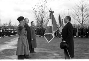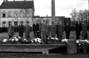 Die alljährlich am 11. November, so auch im Jahr 1952 veranstaltete Gedenkzeremonie im Beisein von Gilbert Grandval, ehemals Militärgouverneur und seit 1952 französischer Generalkonsul im Saarland endete mit der Kranzniederlegung an der Gedenktafel unter Bezeugung militärischer Ehren. Foto: Saarländisches Landesarchiv, Nachlass Erich Oettinger, 198_14.