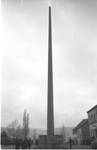 Andere mussten auf einem Balken am Beckenrand balancieren, während eine Waffe auf sie gerichtet wurde. Andere wurden ins Becken hineingestoßen.[15] Die „Neue Saarbrücker Zeitung“ berichtete während der Dauer des dreiwöchigen Prozesses täglich. Daher stand das Löschwasserbecken als Zentrum des Terrors auch im Zentrum der Gedenkstätte. Dazu kam, dass es als einziges Zeugnis des ehemaligen Lagers erhalten geblieben war. Es bildete zusammen mit dem 75 Meter hohen Obelisken eine Achse. Dieser wurde auf der größten der damals noch vorhandenen vier Verkehrsinseln inmitten der Metzer Straße errichtet. Der Mast hatte darüber hinaus noch eine andere Funktion, worauf M.-A. Febvre in der Dezember-Ausgabe des Jahres 1947 in der Architekturzeitschrift „d’Aujourd-hui“ über den Entwurf von Sive hinwies: „Dieser große Mast, eine den Horizont teilenden und den Blick anhaltende Linie, dieser hochaufragende Markstein steht wie ein stummer Wegweiser für den festen Willen, den Weg für neue Überfälle zu sperren…“[16] Dieses markante Denkmal wurde auch als Ausdruck der Skepsis an dem Erfolg der Erziehung der Deutschen zu friedfertigen Menschen gewertet.[17]