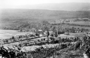 Im Hintergrund das Gasthaus „Neue Bremm“, gesehen vom Rothen Berg auf der Spicherer Höhe aus. Das Gasthaus existiert bis heute und liegt gegenüber der 1947 errichteten Gedenkstätte Neue Bremm. Repro: Thomas Rössler, Historisches Museum Saar.