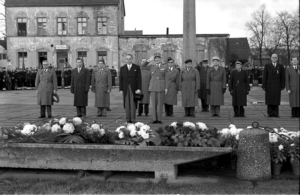 Ehrbezeugung und Gedenkminute des Französischen Botschafters Gilbert Grandval und Vertretern aus Militär und Verwaltung vor dem Pult mit der Gedenktafel für die im Lager Neue Bremm inhaftierten Franzosen bei der Gedenkstunde am 11. November 1952. Quelle: Saarländisches Landesarchiv, Nachlass Oettinger/Presse Photo Actuelle 198_15.