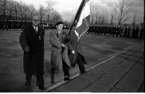 Fahnengruß und Treffen der Militärvertreter mit dem Botschafter Gilbert Grandval auf dem Gedenkplatz, um danach gemeinsam zum Pult mit der Gedenktafel zu gehen bei der Gedenkstunde am 11. November 1952. Quelle: Saarländisches Landesarchiv, Nachlass Oettinger/Presse Photo Actuelle 198_8.