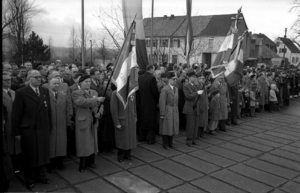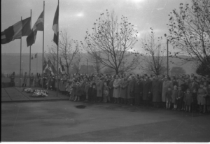 Gang der Vertreter einer französischen Veteranenorganisation zu der ihnen bei den Gedenkstunden zugewiesenen Seite am Rand des Gedenkplatzes bei der Gedenkstunde am 11. November 1952. Quelle: Saarländisches Landesarchiv, Nachlass Oettinger/Presse Photo Actuelle 198_24.