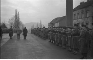 Gang der Vertreter einer französischen Veteranenorganisation zu der ihnen bei den Gedenkstunden zugewiesenen Seite am Rand des Gedenkplatzes bei der Gedenkstunde am 11. November 1952. Quelle: Saarländisches Landesarchiv, Nachlass Oettinger/Presse Photo Actuelle 198_21.