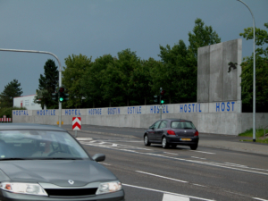 Ansicht der Vorderseite der 2004 neugestalteten Gedenkstätte Gestapo-Lager Neue Bremm. Die Neugestaltung der Gedenkstätte verweist auf den wechselvollen Charakter des Ortes – heute Hotel, gestern Lager – als Durchgangsstation mit höchst unterschiedlichen Vorzeichen. Dabei wird nicht nur an das Lager, sondern auch an die Geschichte der Gedenkstätte nach 1945 erinnert. Das Schriftband an der Straßenseite der Gedenkstätte nennt Begriffe, die auf die indoeuropäische Wurzel „ghosti“ und das lateinische „hosti“ zurückgehen. Dabei wechseln auf dem Schriftband die negative und positive Bedeutung der aufgeführten Begriffe. Das Englische „Hostile“ bedeutet „feindlich“. Aus dem Englischen stammen auch die Begriffe „Hostel“ bzw Herberge, „Hotel“ und „Host“ beziehungsweise „Gast“ sowie „Hostage“ bzw. Geisel. Auch sie gehen aus dieser Wurzel hervor. Auch das italienische Wort für „feindlich“ „Ostile“ geht auf das lateinische „hosti“ geht auf das indoeuropäische „ghosti“ zurück.