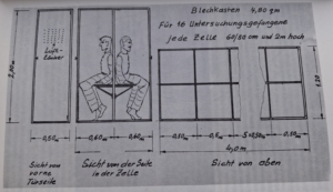 Zeichnung des sogenannten „Verhörkäfigs“, in den Gestapo-Häftlinge im Saarbrücker Schloss, dem Sitz der Gestapo in den Jahren 1935 bis 1945 auf ihr Verhöre warten mussten. Quelle: Renger/Bernard, 1999. S. 86