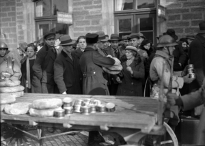 Französische Soldaten verteilen im Januar 1935 am Bahnhof Sarreguemines Proviant an die Flüchtlinge aus dem Saargebiet vor ihrer Weiterreise nach Frankreich. Quelle: SaarLA, F02-057-343. Fotograf: unbekannt.