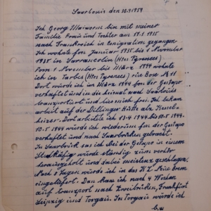 Der Wirkfaktor „Ideologie“ zeigte sich hingegen bei dem 1908 in Saarlouis geborenen Georges M. Der Bergmann war 1935 nach Frankreich geflohen und hatte Arbeit in der Metallindustrie in Tarbes im Südwesten Frankreichs gefunden. Dort blieb er fast zehn Jahre, nur unterbrochen von der ein Jahr dauernden Einberufung in die Französische Armee. Das geschah, weil M. offenbar sich um die französische Staatsbürgerschaft bemüht hat, da er in seinem Antrag auf Entschädigung (LA SB, LEA 16138) die Formulierung „Francaise par Option“ angibt. Das verweist auf diese Möglichkeit und erklärt, warum er ein Jahr in Frankreich Dienst tat. Es führte jedoch auch dazu, dass er nach seiner Verhaftung im März 1944 durch Gestapo ins Saarland überführt wurde. Jedoch sah es erst danach aus, als ob der Pragmatismus Vorrang habe, da er von April bis Mai 1944 in der Dillinger Hütte eingesetzt worden war. Nach einem Monat wurde er jedoch erneut verhaftet und in das Lerchesflur Gefängnis in Saarbrücken und von dort in das Gestapo-Lager Neue Bremm verbracht. Wie aus seinem seiner Akte beigefügten Verfolgungsbericht hervorgeht, wurde er mehrfach in Saarbrücker Schloss, dem damaligen Sitz der Gestapo gebracht und verhört.